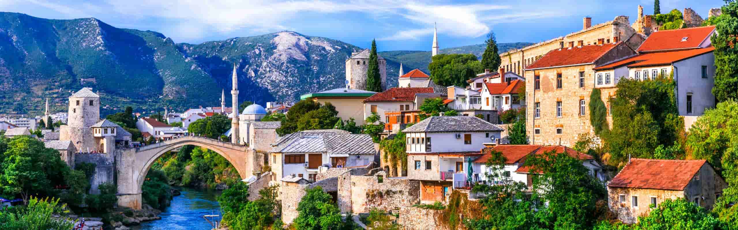 オスマン帝国の支配下時代の影響か、中東のような雰囲気が残るモスタル。街の中央を流れるネトレヴァ川にかかる橋「スターリ・モスト」はモスタルの象徴です。主にドブロヴニクからのオプショナルツアーや、スプリットへの専用車移動の立ち寄りで訪れます。