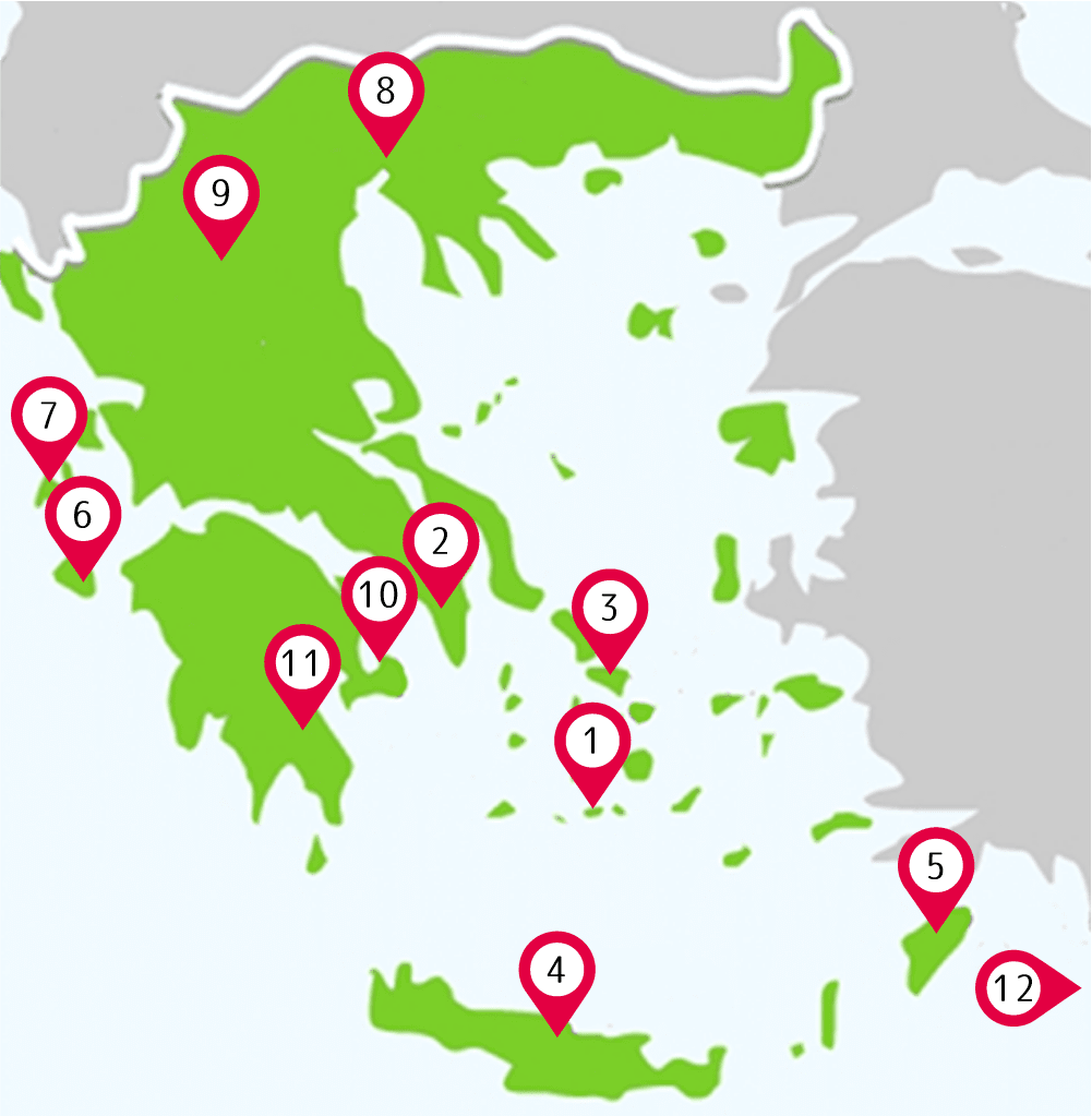 オリーブと神話の島。「ラビリンス」の語源ともなった「クノッソス宮殿」の遺構が残り、現実と神話をつなぐ存在です。一方でクレタ島の人々の食生活はオリーブとともにあり、ギリシャの中でも長寿の島として有名。グルメ旅行にも。